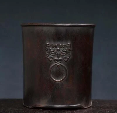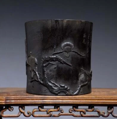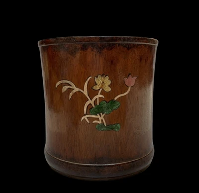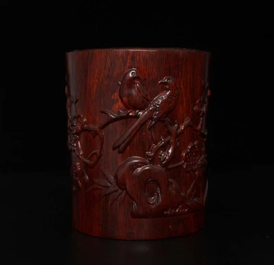 Old Chinese Wood Brush Pot w/bird